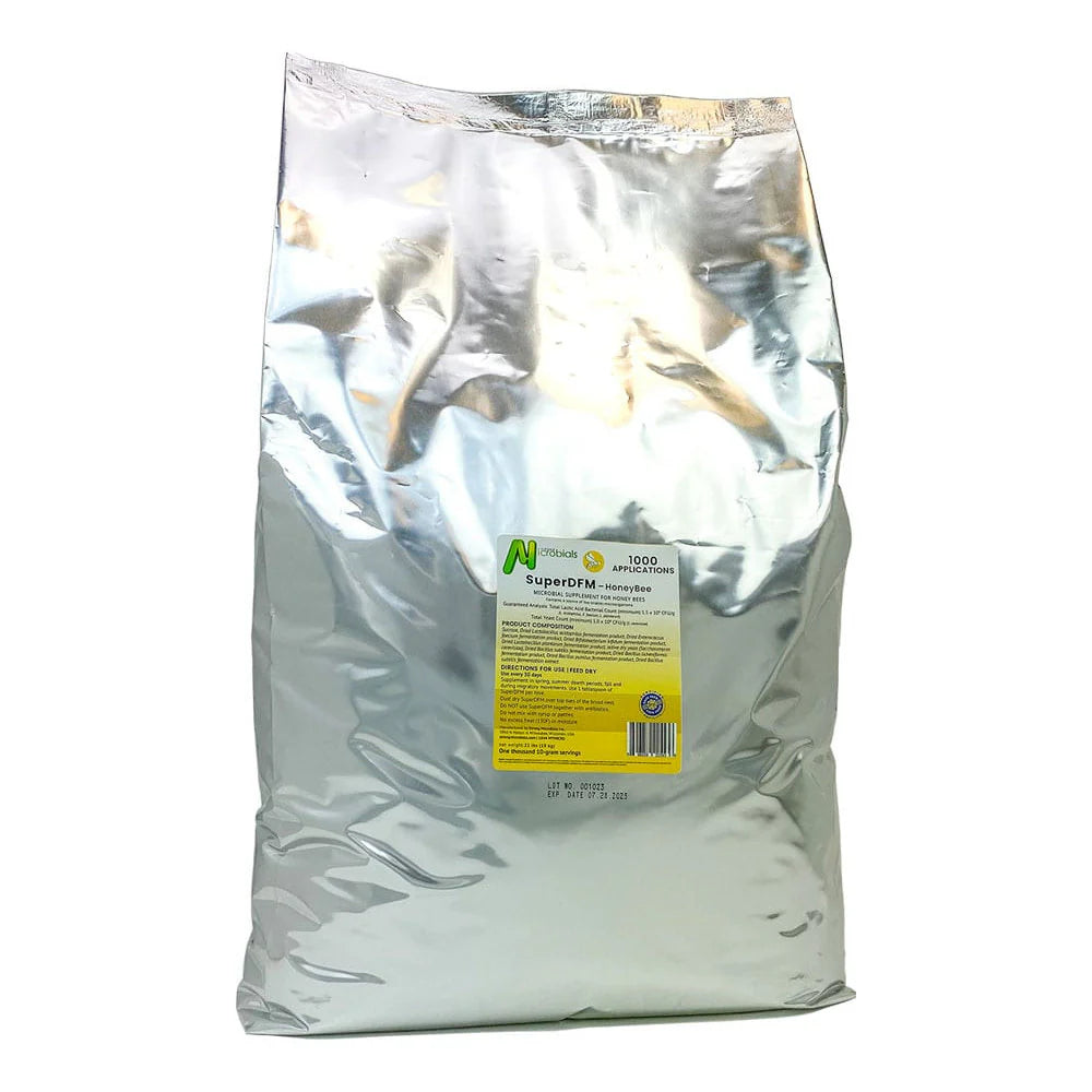 Super DFM – HoneyBee. Beneficial Microbes support gut health in honey bees. All-natural probiotic supplement for honeybees. Supports strong immunity. Excellent digestive aid. Supports gut health. Wide array of lactic acid bacteria. Beneficial Bacillus subtilis, Bacillus licheniformis & Bacillus Pumilus. Live Yeast culture. Enzymes – prebiotics. Directions, use SuperDFM-HoneyBee 4 times a year: Spring, Fall, Dearth periods & Migratory Movements. FEED DRY. Use 1 tablespoon of SuperDFM-HoneyBee per hive per supplementation period. Dust dry SuperDFM-HoneyBee over top bars of the brood nest. Apply SuperDFM-HoneyBee two weeks after any conventional treatments for nosema or foulbrood.